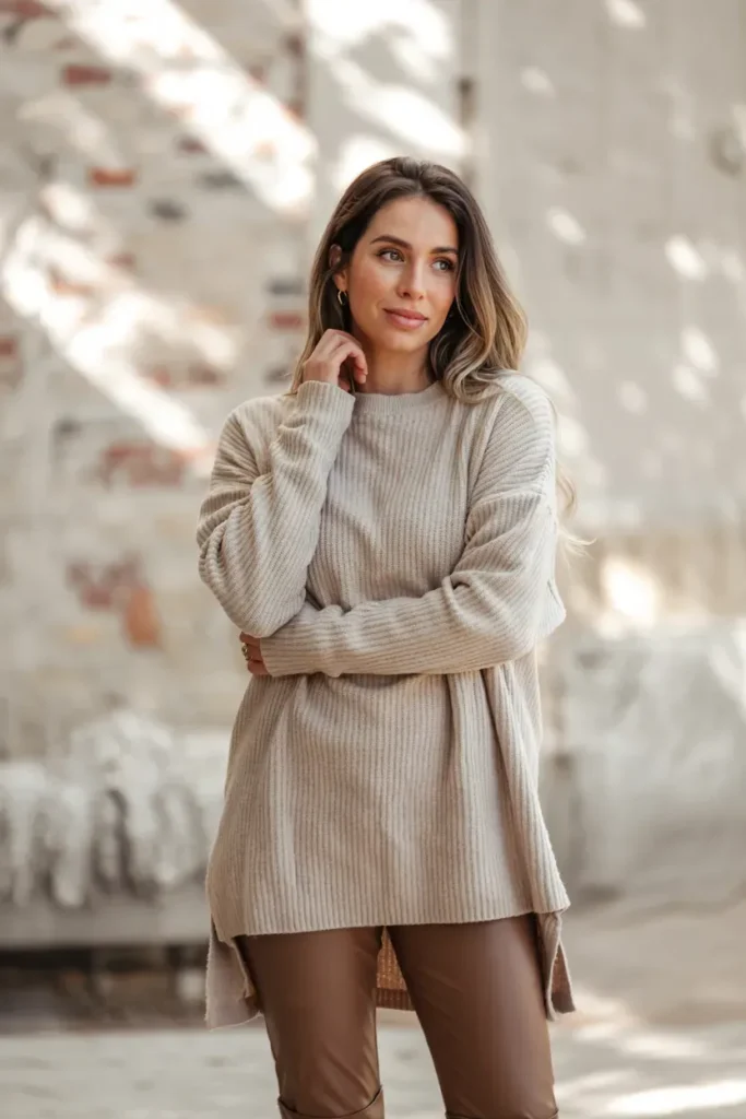 A chunky sweater dress layered over leggings gives extra warmth while still feeling feminine and cozy. Perfect for brunch or casual gatherings.