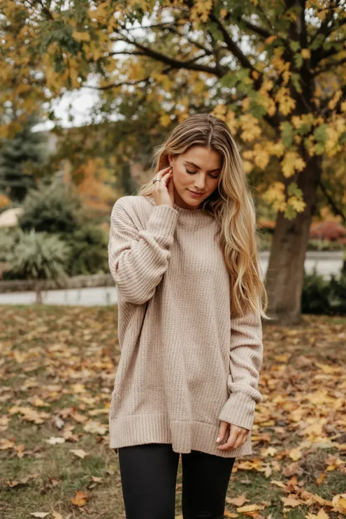 An oversized knit sweater with classic black leggings is a fall essential.