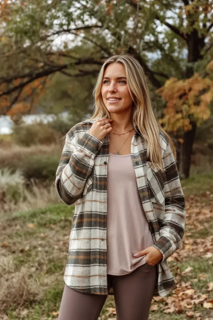 Shackets are a fall staple that instantly make leggings look styled. Pair with a fitted top underneath to balance the oversized layer.