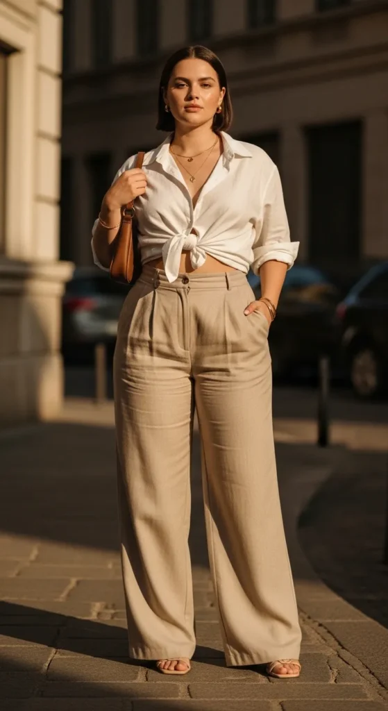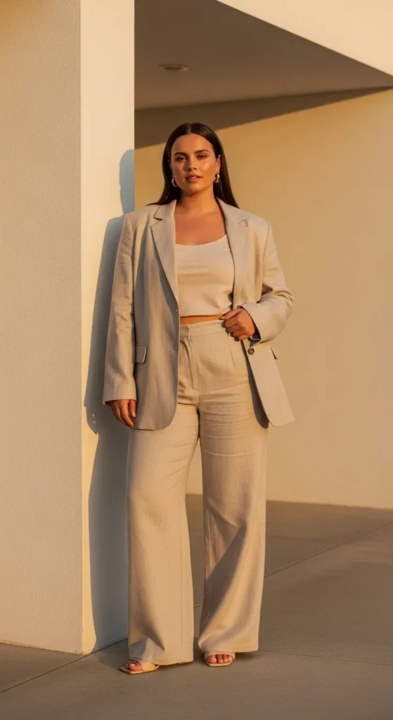 This outfit works because linen breathes with your body. It doesn’t stick, and it naturally creates a long vertical silhouette.