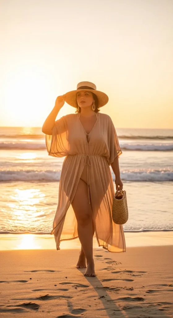 10. Elegant Beach Outfit with Flowing Cover-Up Layers