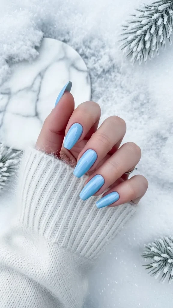 Icy blue nails capture winter perfectly without screaming holiday. This shade feels crisp, calming, and surprisingly wearable.
