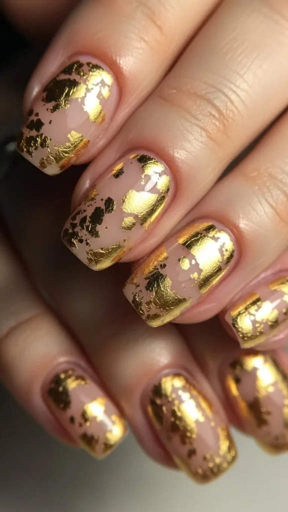 Think tiny gold flakes, thin foil lines, or minimalist dots over a nude base.