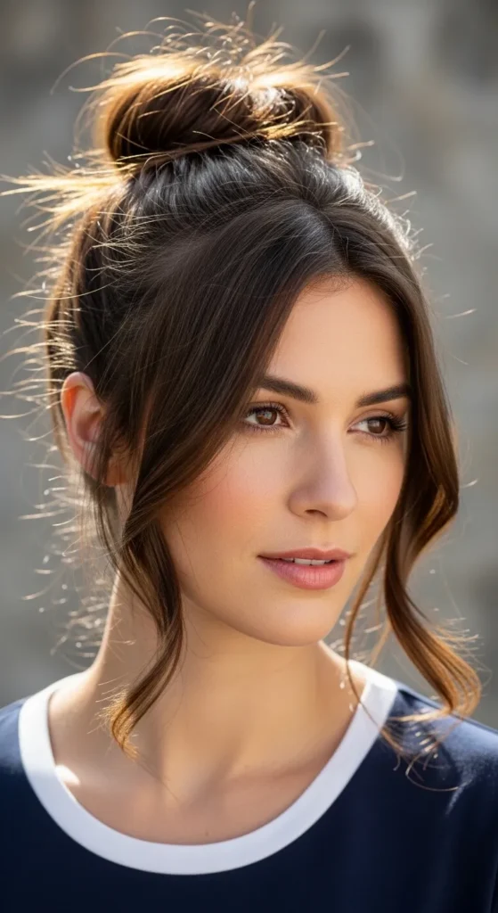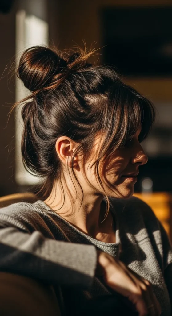 A relaxed top knot with face-framing pieces feels youthful and effortless. It’s one of those Brunette Hairstyles that works for almost everyone.