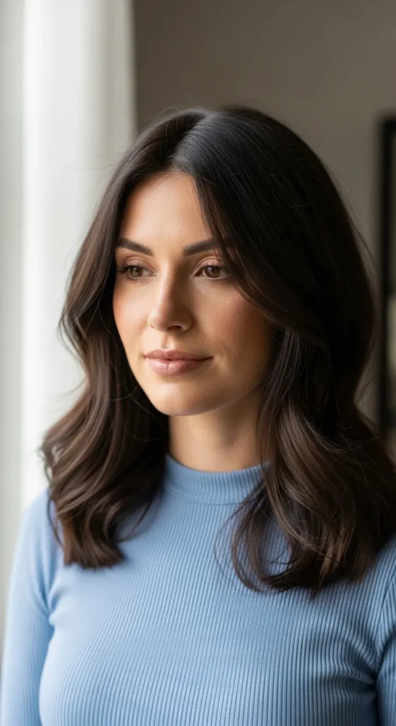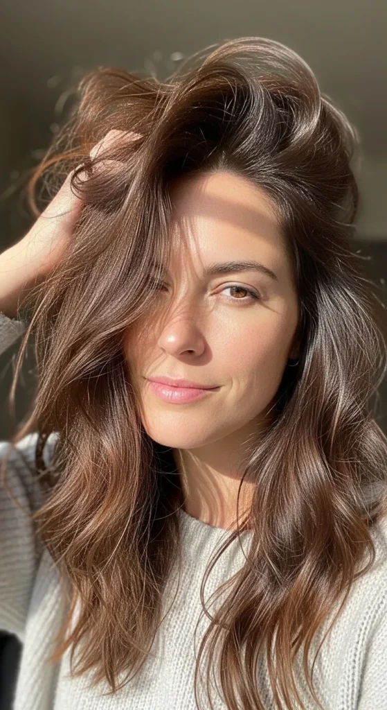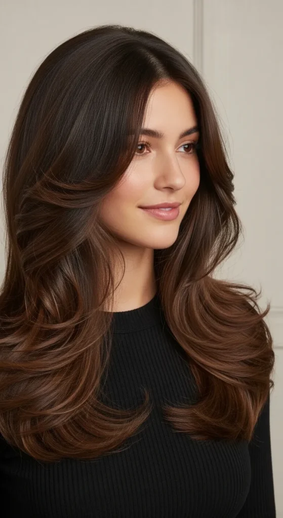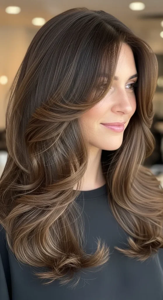 Long layered hair adds depth and dimension to brunette tones, especially when styled with loose waves. This look keeps hair from feeling heavy and works well for women who want movement without sacrificing length.