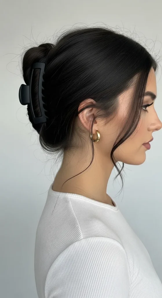 Claw clips are back—and they look amazing on brunette hair. This updo is quick, trendy, and surprisingly elegant.