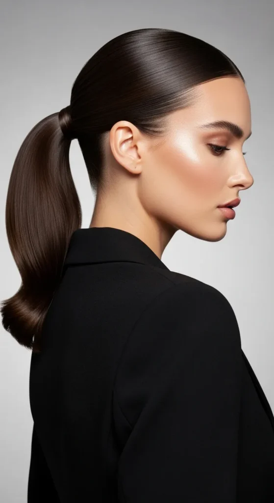 A sleek ponytail may sound simple, but it’s incredibly powerful on brunette hair. The middle part keeps it modern and flattering.