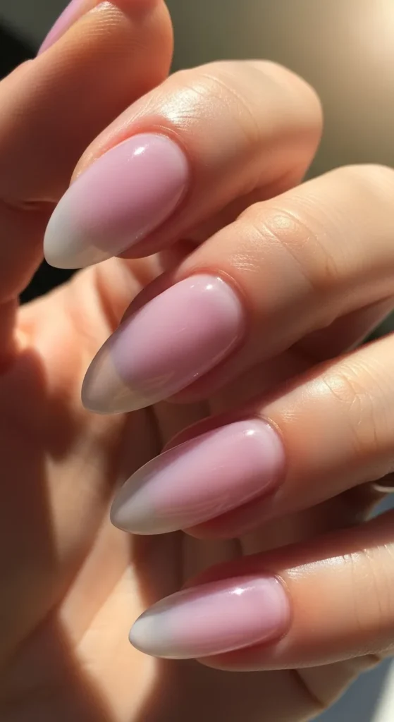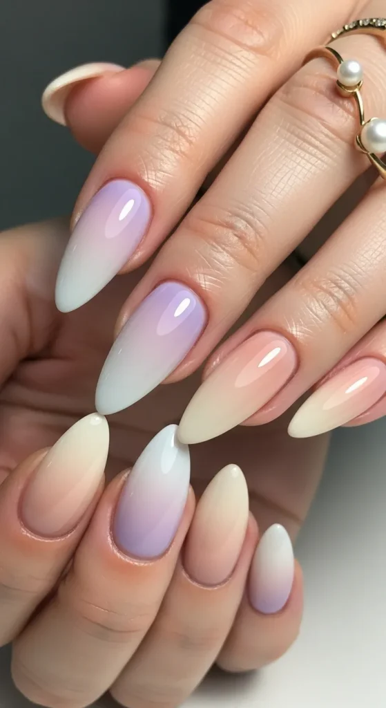 A soft gradient from nude to lavender creates a dreamy ombre effect. This design feels airy and sophisticated, making it great for both casual and formal moments.