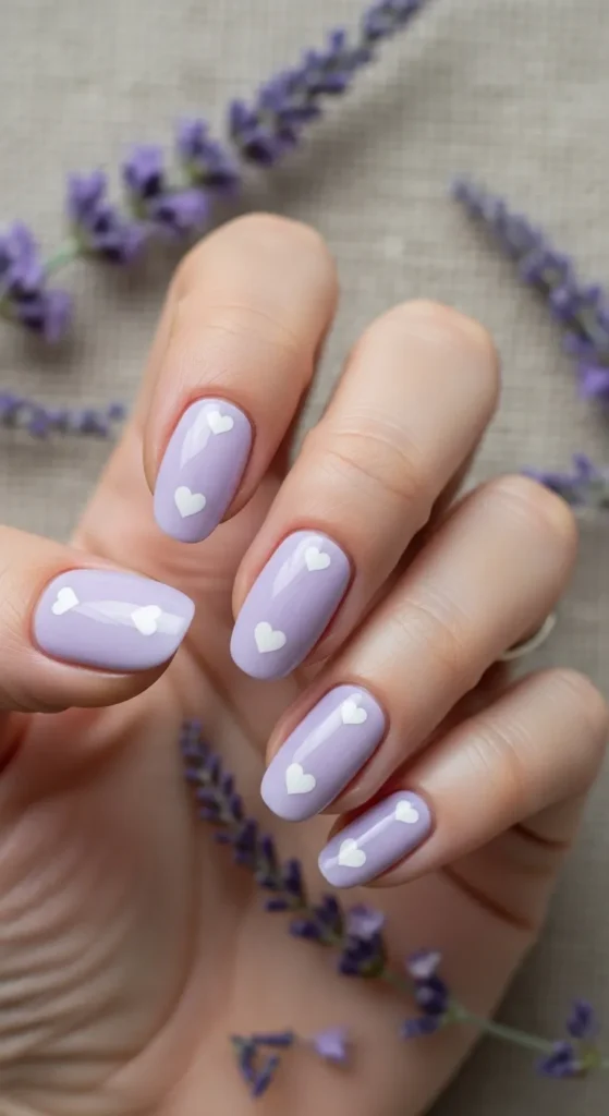 Tiny heart details over lavender polish add a playful, sweet touch. This design is cute without being childish and very popular for Pinterest saves.