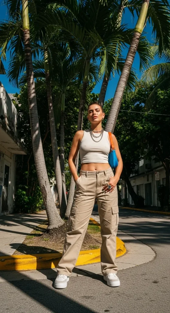 Cargo pants bring structure, while a fitted crop top keeps it feminine.