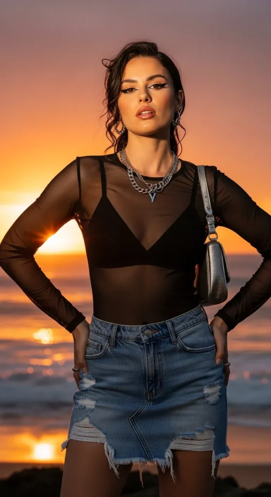 A sheer mesh top over a bralette paired with a mini skirt creates that edgy-meets-beach aesthetic.