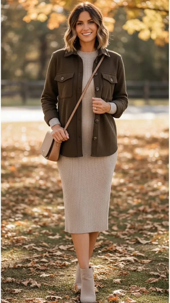 A shirt-jacket (shacket) is a Pinterest favorite for a reason. It adds warmth without heaviness and works perfectly over fitted dresses.