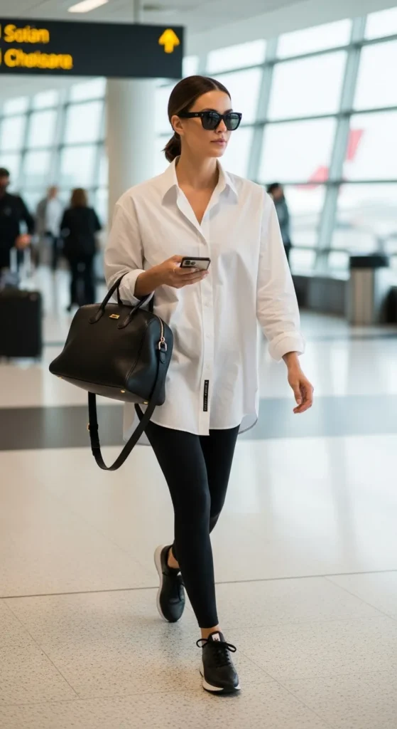 A loose button-down layered over leggings creates an easy, polished airport outfit.