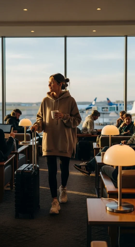 A matching lounge set is one of the easiest airport outfits you can wear. Soft fabrics feel cozy on long flights, while the coordinated look instantly appears polished.