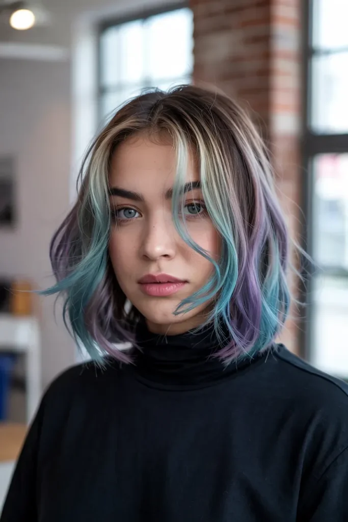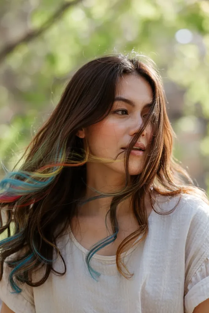 Tiny pops of rainbow hidden throughout the hair give just enough color to feel fun without overwhelming the look.