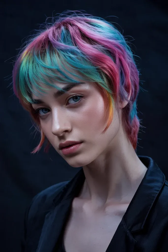 Short hair doesn’t mean boring. A rainbow bob feels modern, chic, and surprisingly easy to maintain compared to longer rainbow styles.