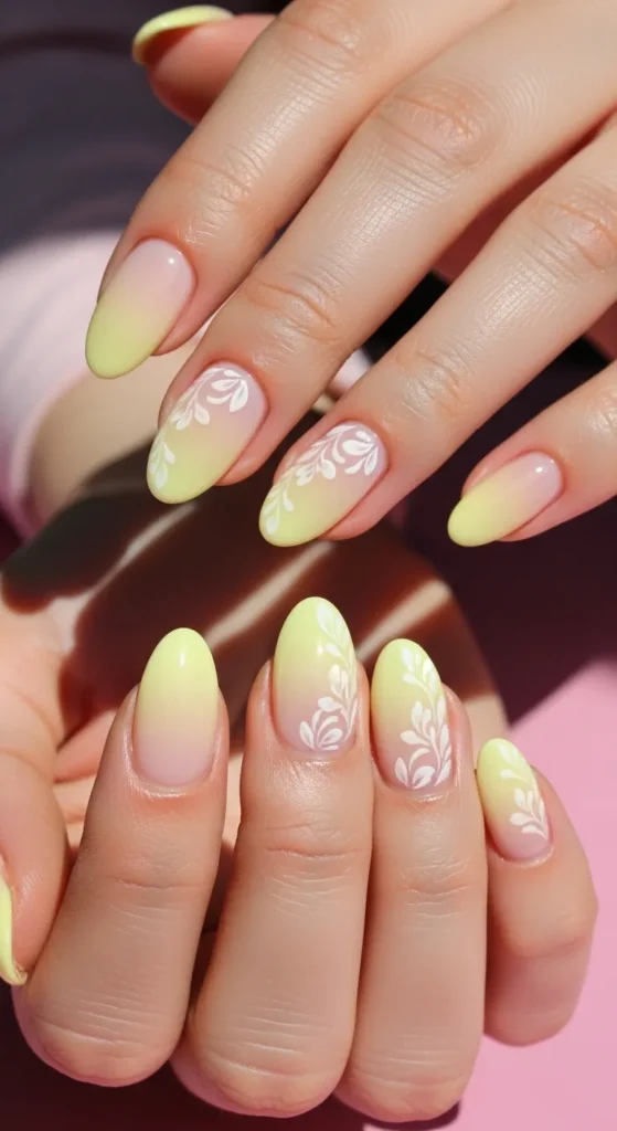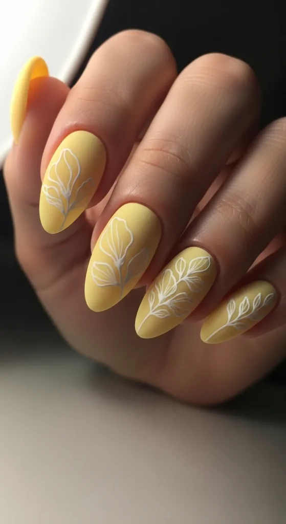 5. Yellow Oval Nails with Soft White Floral Patterns