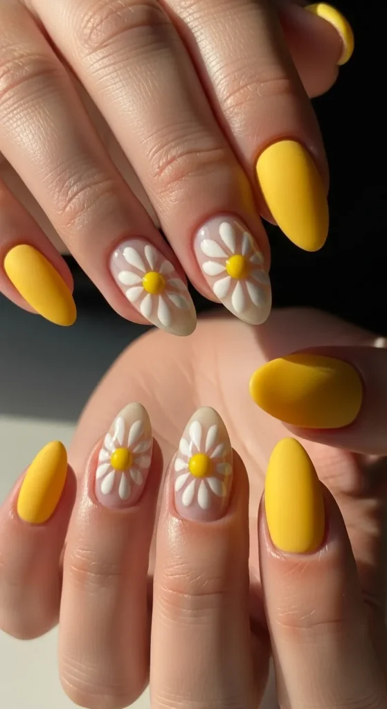 6. Matte Yellow Nails with Glossy Daisy Art