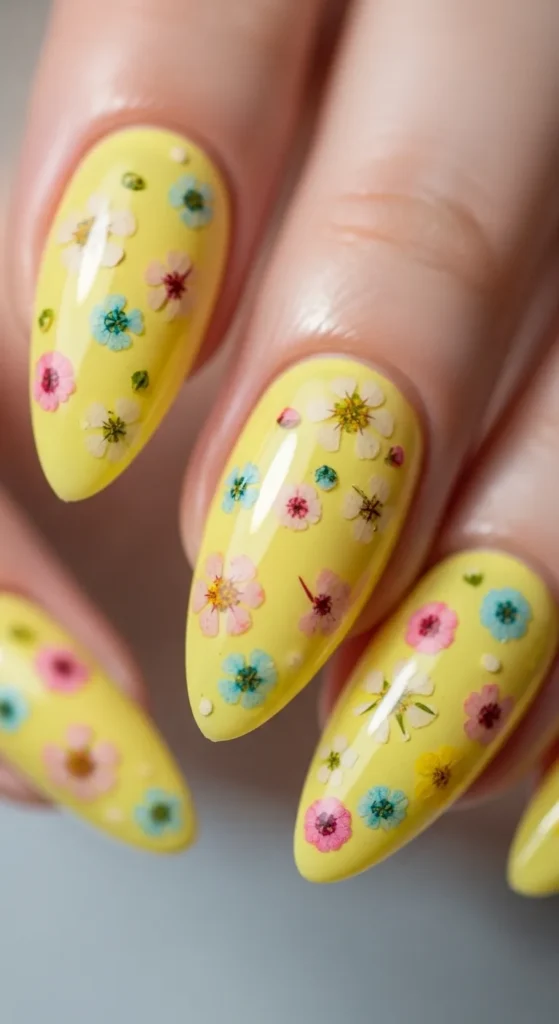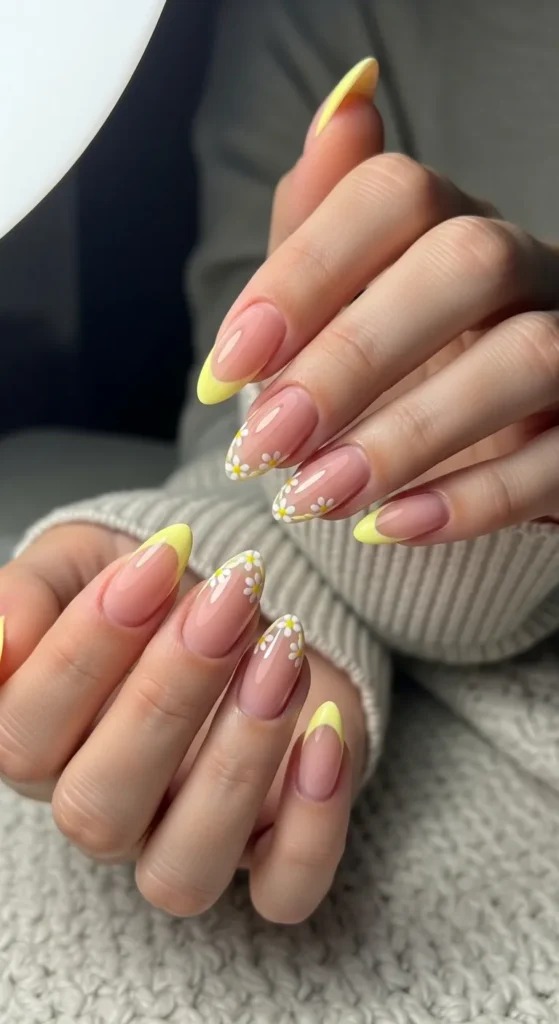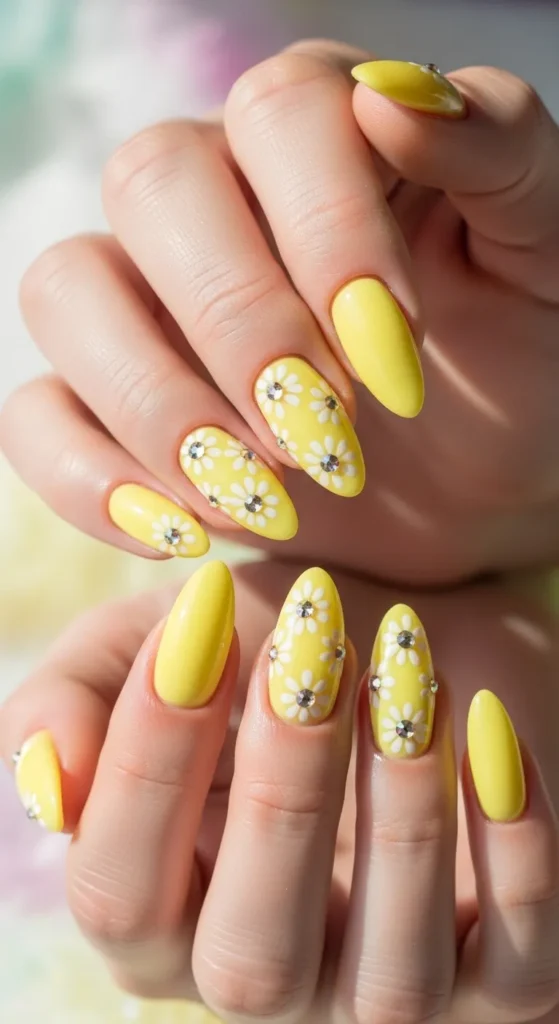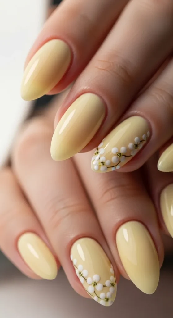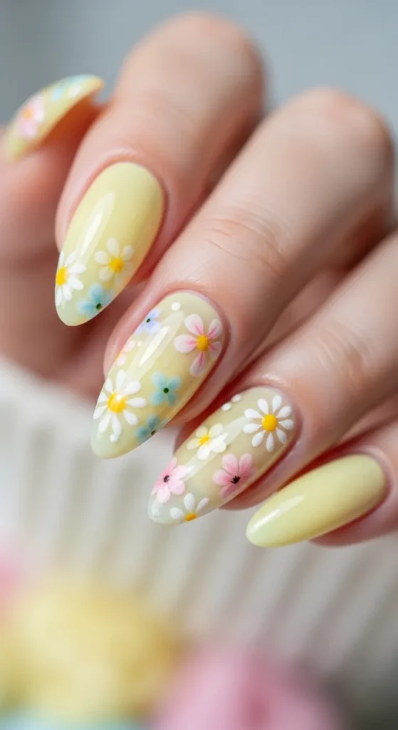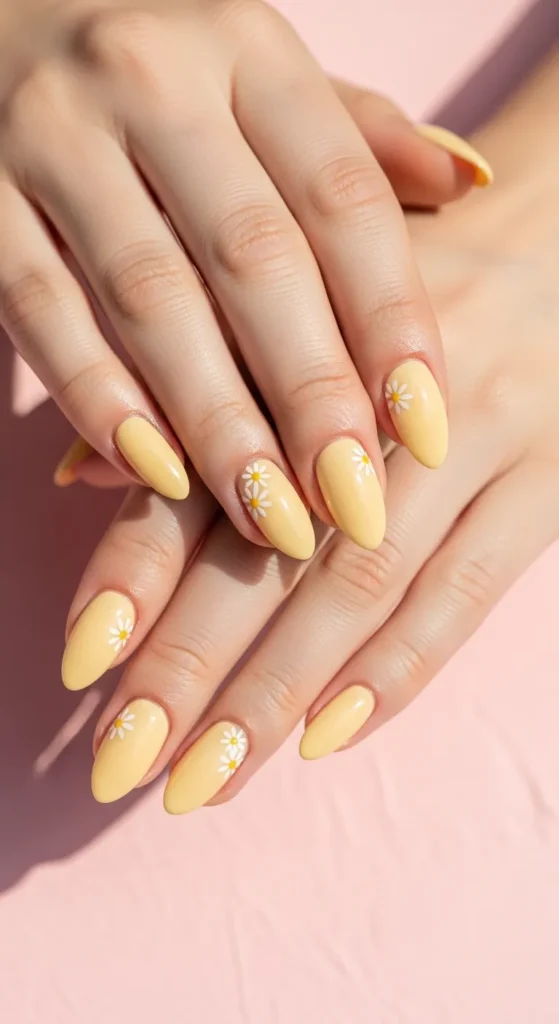 1. Soft Butter Yellow Almond Nails with Daisy Accents