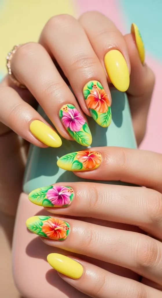 18. Holiday Yellow Nails with Tropical Florals