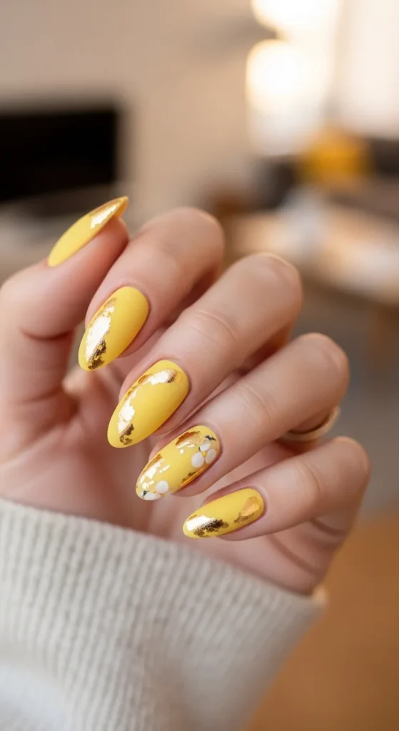 8. Yellow Nails Aesthetic with Gold Foil Details
