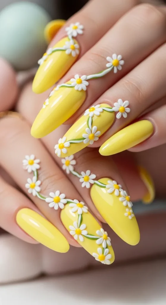 10. Bright Yellow Almond Nails with White Daisy Chains