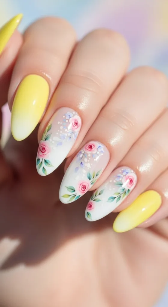 9. Pastel Yellow Acrylic Nails with Mixed Floral Designs