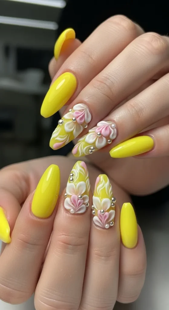 2. Bright Yellow Acrylic Nails with 3D Floral Art