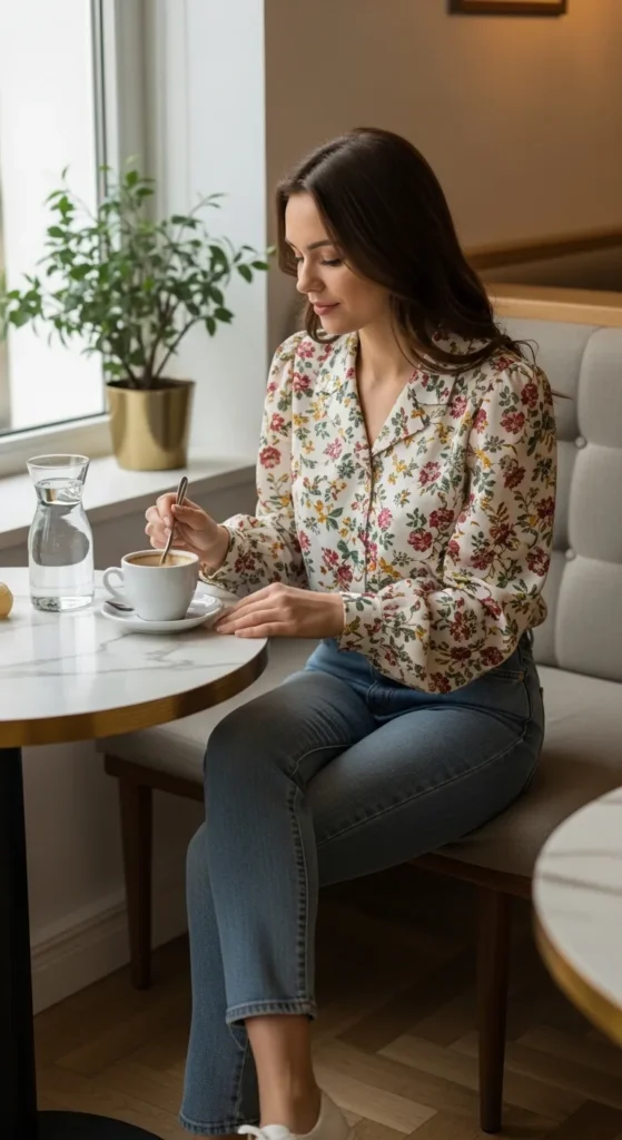 A soft, feminine blouse paired with jeans is perfect for a brunch date. Think ruffles, subtle prints, or light fabrics. It’s flirty without being overdone and works well for breakfast date outfit ideas.