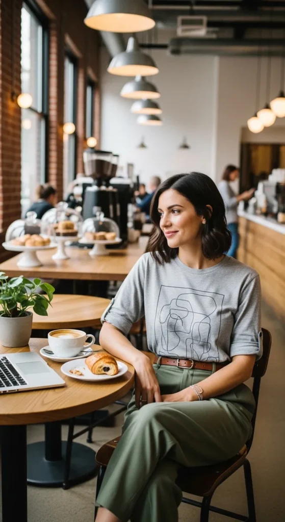 This combo balances casual and classy perfectly. A vintage-style tee paired with high-waisted tailored pants creates a brunch-ready look that feels modern and wearable.