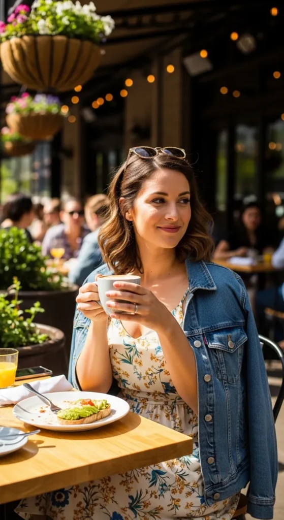 A lightweight sundress layered with a denim jacket is an easy brunch win. It’s flattering, comfortable, and adaptable if temperatures change.