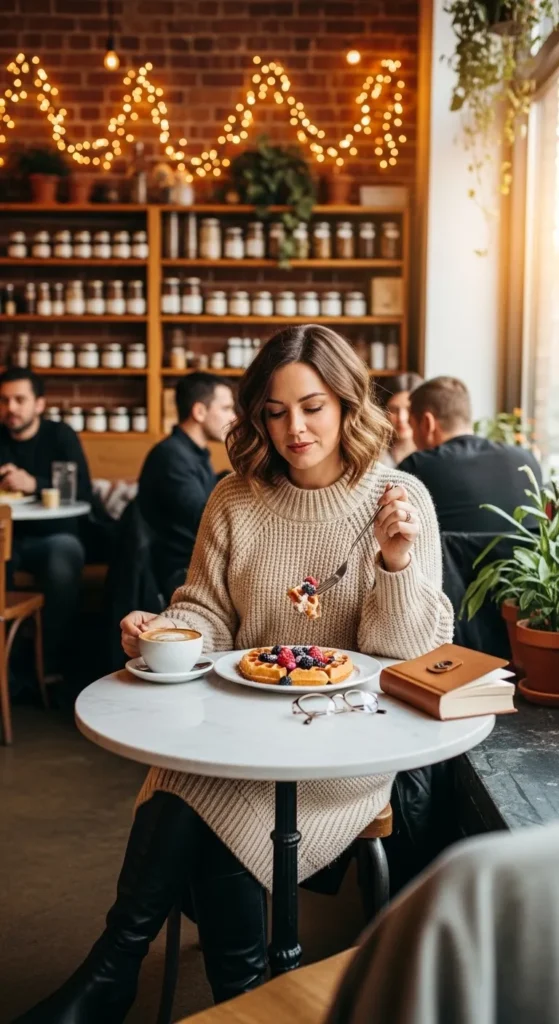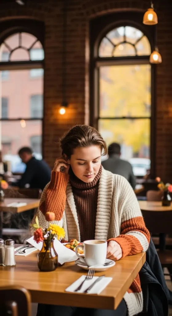 Layering a lightweight sweater over a dress or jeans adds warmth without bulk. Neutral tones work best for a cozy, chic brunch vibe that feels seasonal yet relaxed.