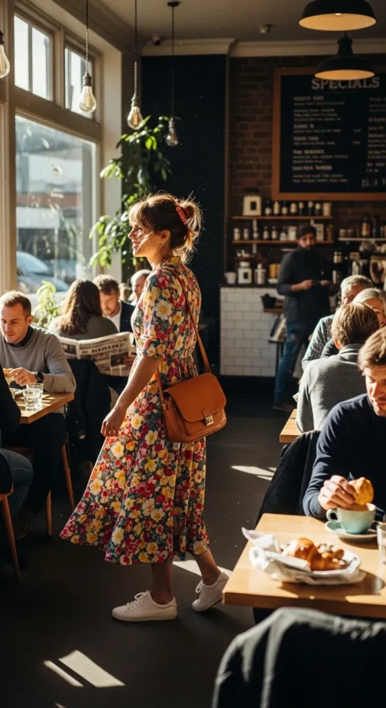 A flowy midi dress moves beautifully while sneakers keep things practical for walking or café hopping.