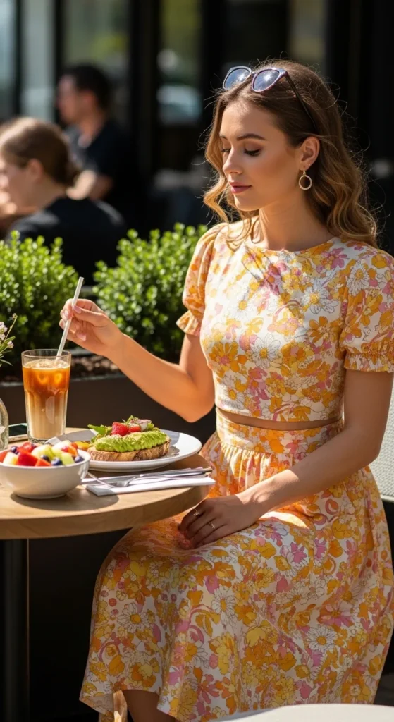 Nothing says brunch like florals in spring. A breezy floral dress paired with flats feels fresh and timeless. Ideal for lunch outfits in spring or outdoor café brunches.
