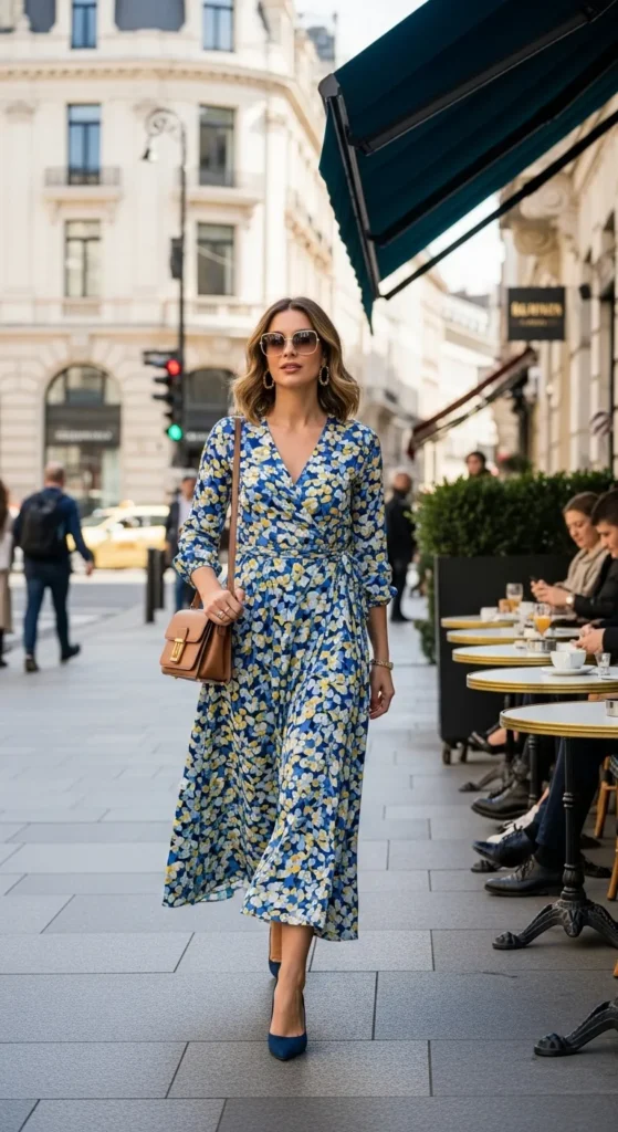 Wrap dresses are universally flattering and perfect for brunch. They define the waist without feeling restrictive and pair beautifully with low heels. This look transitions seamlessly from brunch to afternoon errands or coffee dates.