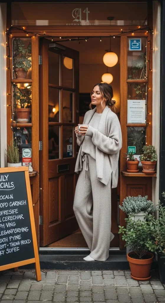 A soft knit or ribbed lounge set instantly looks polished when styled right. Neutral tones, clean sneakers, and a structured bag elevate this comfy brunch outfit.