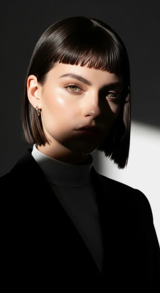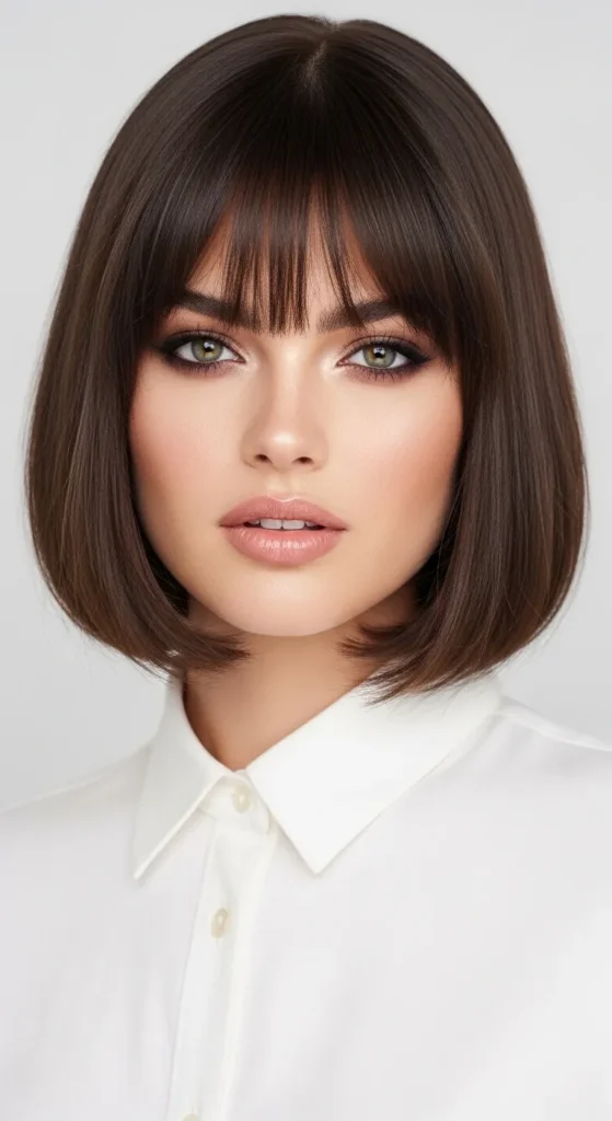 A bold, straight-across bob paired with full bangs makes a serious statement. This look is sharp, fashion-forward, and perfect for women who love clean lines.