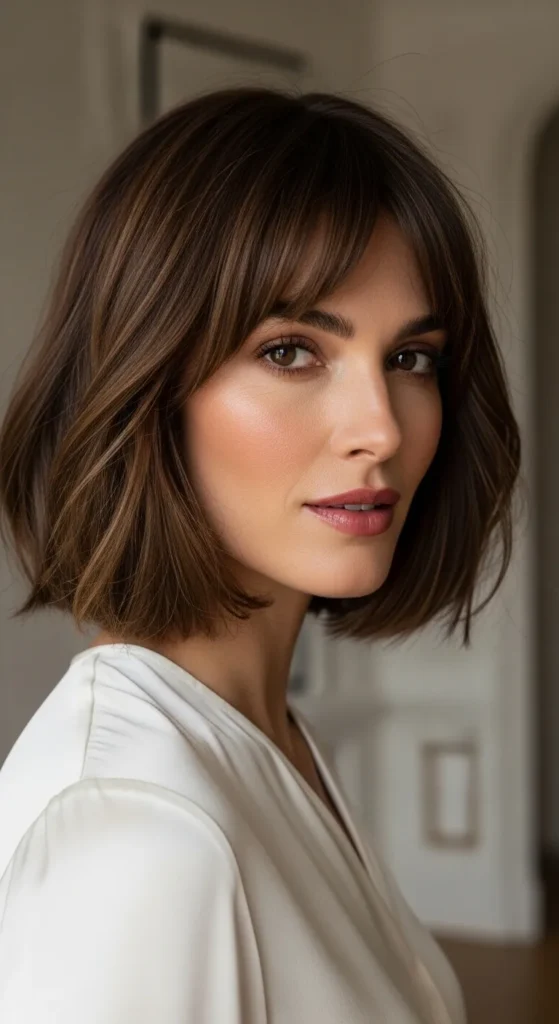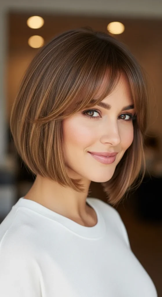Side-swept bangs soften facial features and make this bob incredibly versatile. It’s one of the most saved styles because it works in both professional and casual settings.