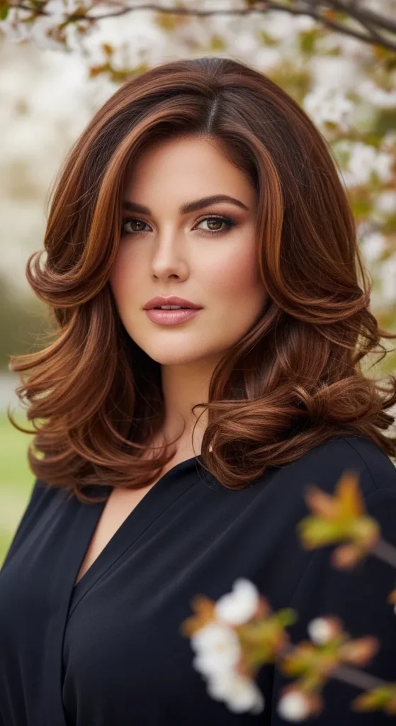 Rich chestnut brown hair paired with soft layers creates a glossy, dimensional look. The warm tones add depth and shine, while the waves provide natural movement.