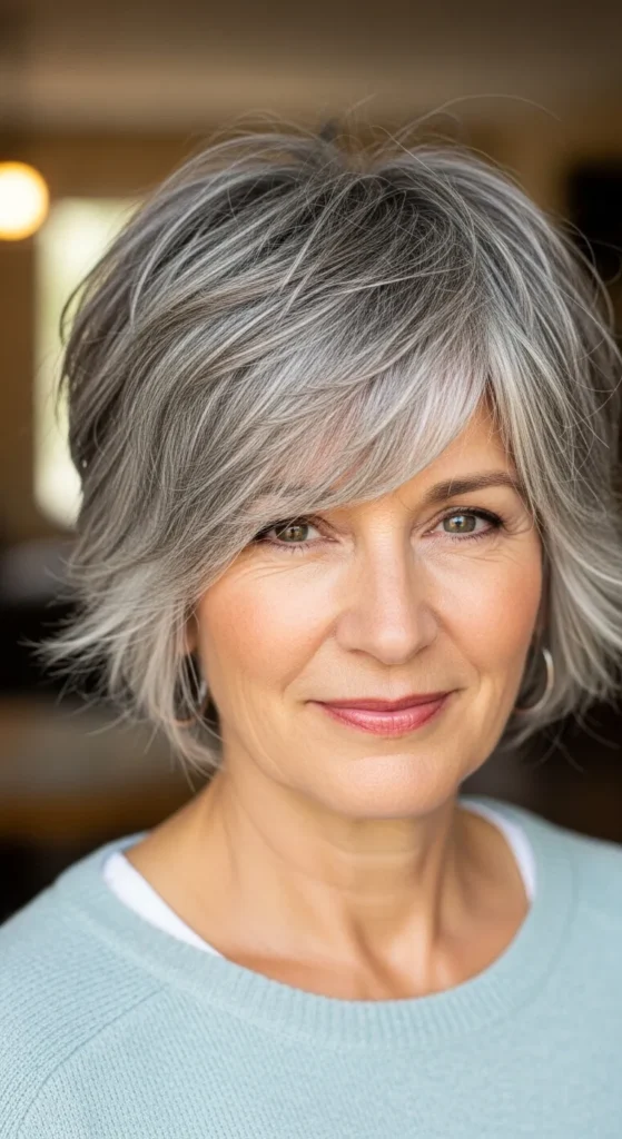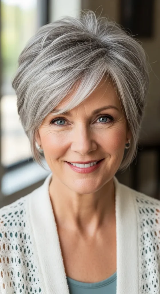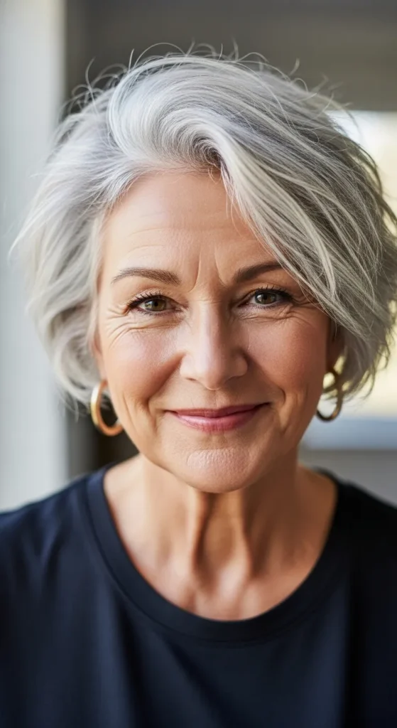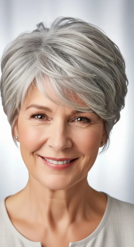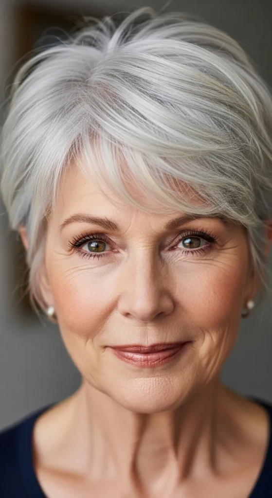 Letting gray hair shine in a pixie cut is powerful and modern. The short length enhances natural texture while making silver tones look intentional and stylish.