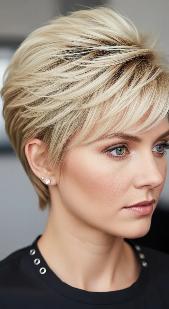 Choppy layers add edge and dimension. This pixie works beautifully for women who want a youthful, modern finish without committing to extreme styles.