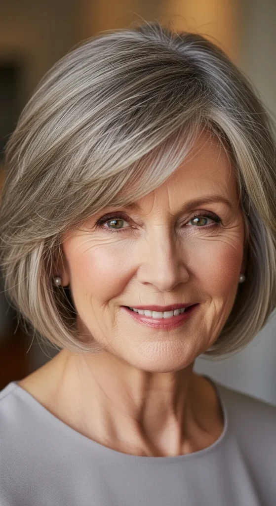 Soft bangs add balance and can subtly hide forehead lines. Keep them wispy rather than blunt for a natural finish.