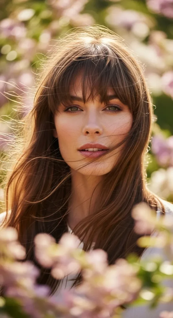 Wispy bangs soften long hair and add interest without commitment. They’re airy enough for spring and easy to style.