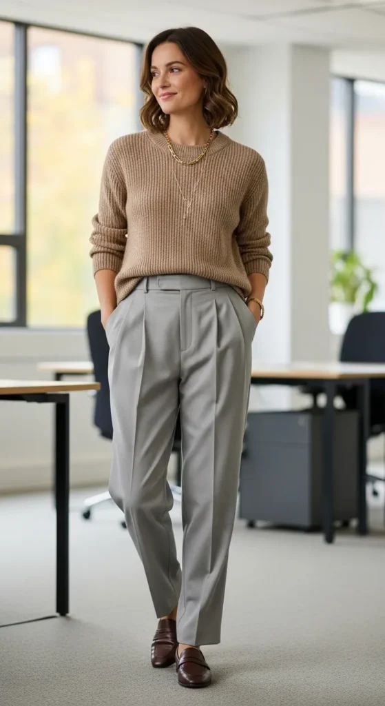 Ribbed sweaters add texture while pleated trousers bring polish. This outfit is ideal for women who want warmth without sacrificing a professional appearance.