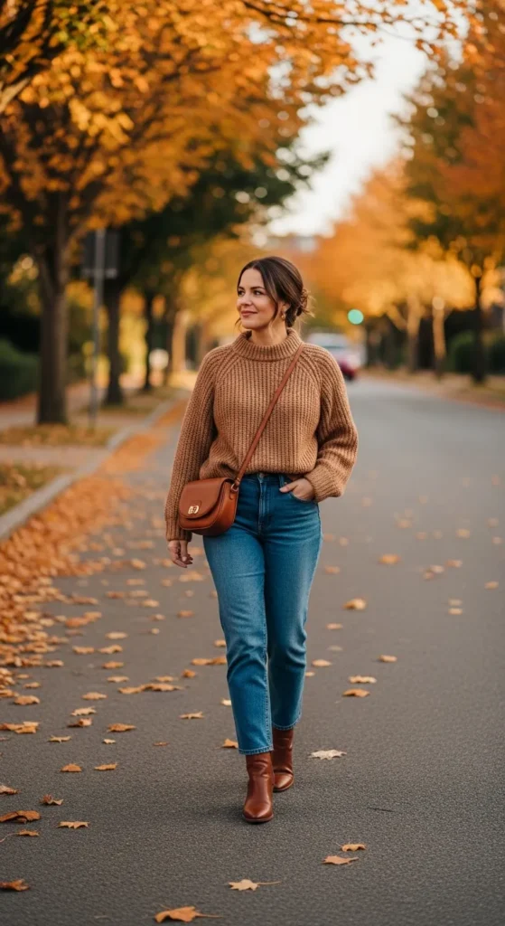 A camel sweater instantly gives any outfit a rich, timeless feel. Pair it with straight-leg jeans for balance and finish with leather ankle boots.