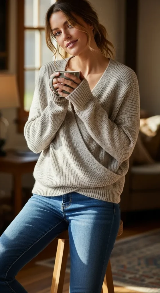 Wrap sweaters create a soft, flattering shape. Paired with dark denim, this look feels cozy yet refined.