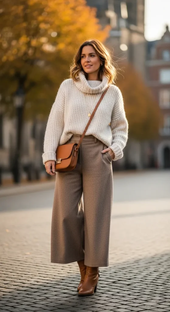 Wide-leg pants balance out chunky sweaters beautifully. This look feels modern, cozy, and perfect for casual outings or fall travel.