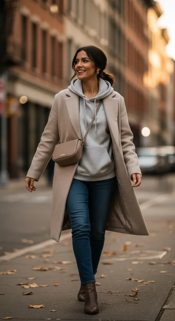 A hoodie under a wool coat blends comfort with sophistication. Stick to muted tones like beige or gray to keep the look elevated rather than sporty.