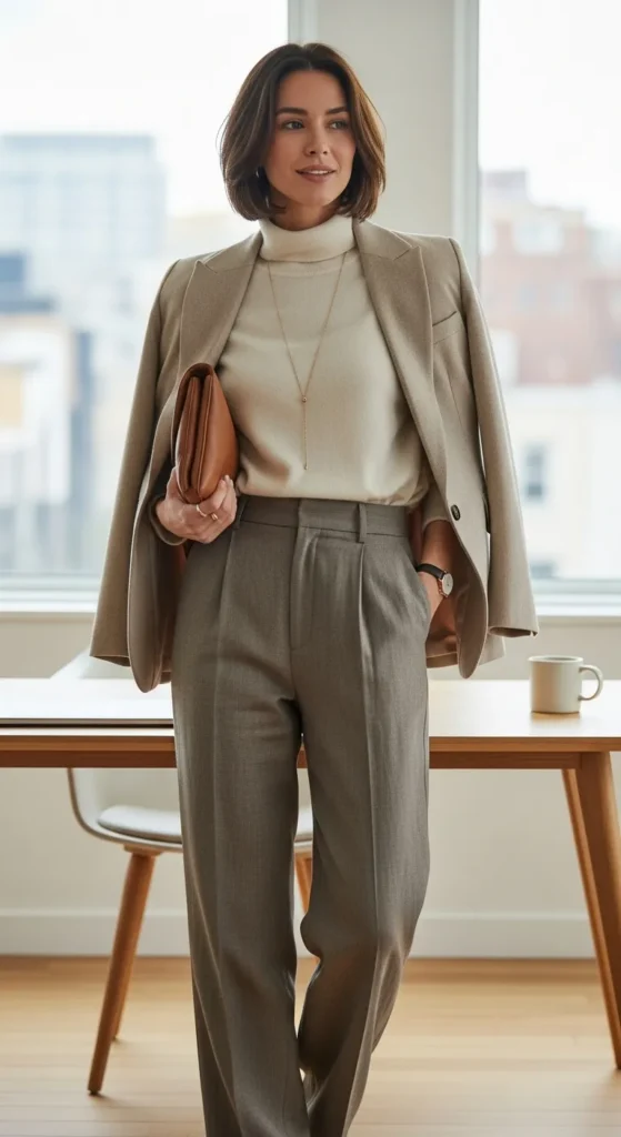 A cream turtleneck tucked into tailored wool trousers creates a clean, elevated silhouette. This outfit feels warm, flattering, and perfect for casual workdays or polished errands.