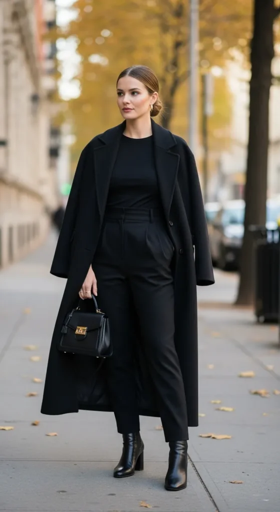 An all-black base layered under a wool coat always looks chic. Itâs simple, flattering, and perfect for cooler fall days.